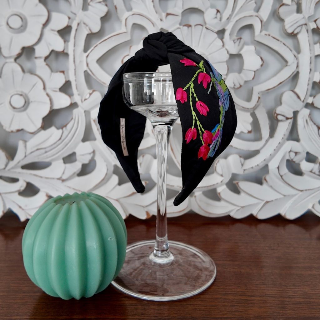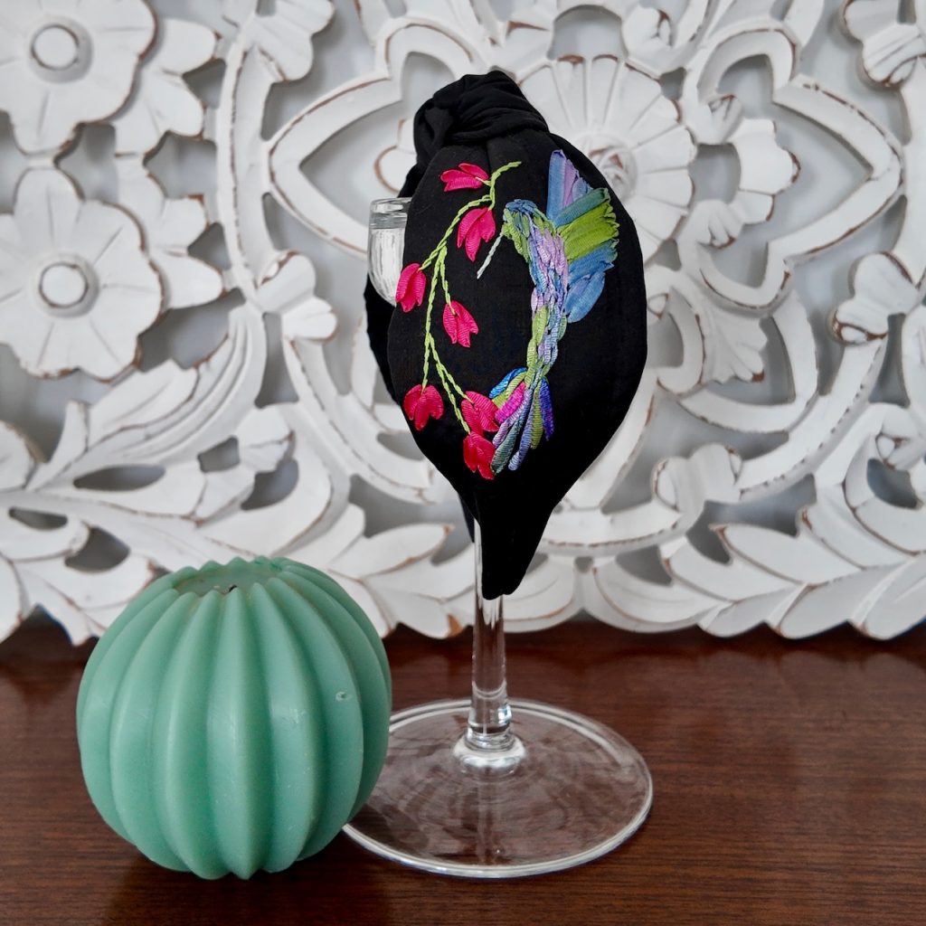 Diadema nudo, adaptable a todas las tallas, cómoda y suave, en seda salvaje negra , con colibrí bordado a mano en cinta e hilo.