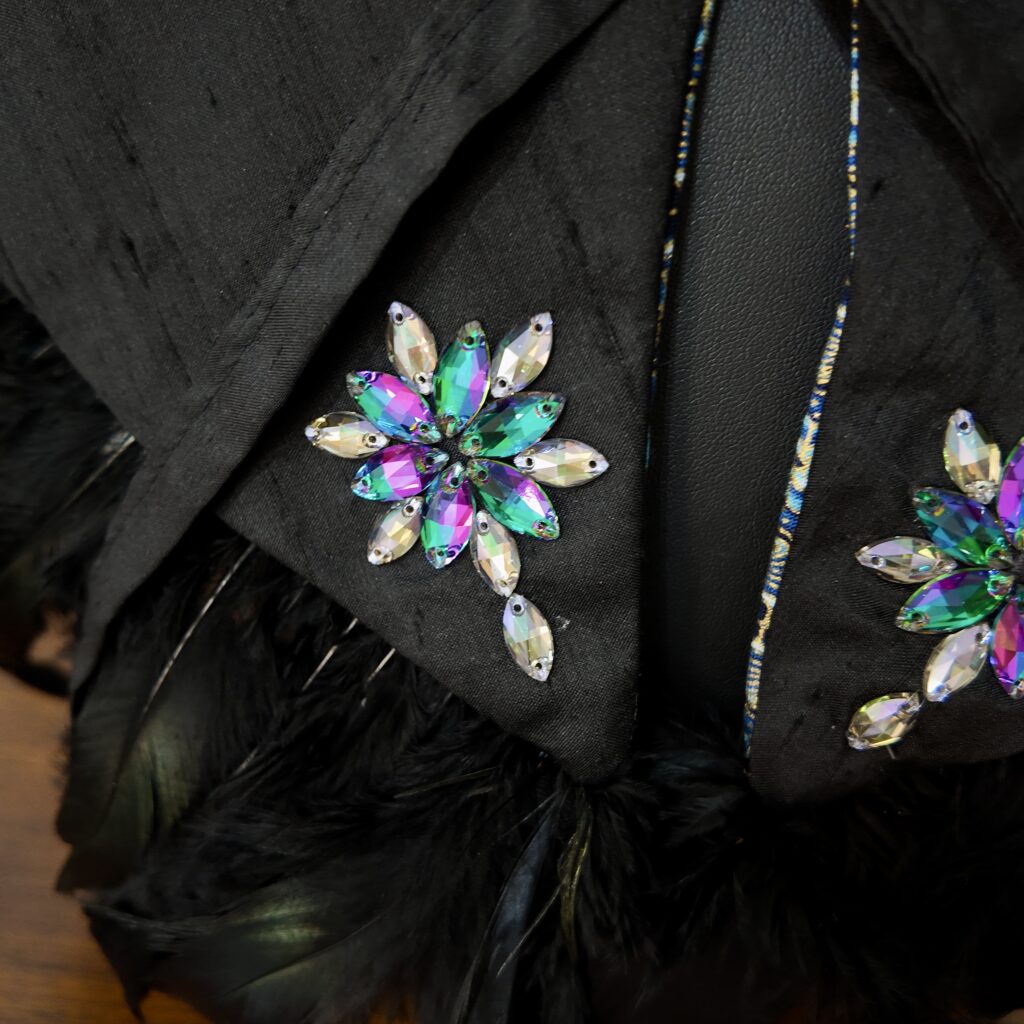 Cuello de seda natural negra, con aplicaciones de cristal y pluma natural de gallo, negra con tornasol verde.
