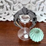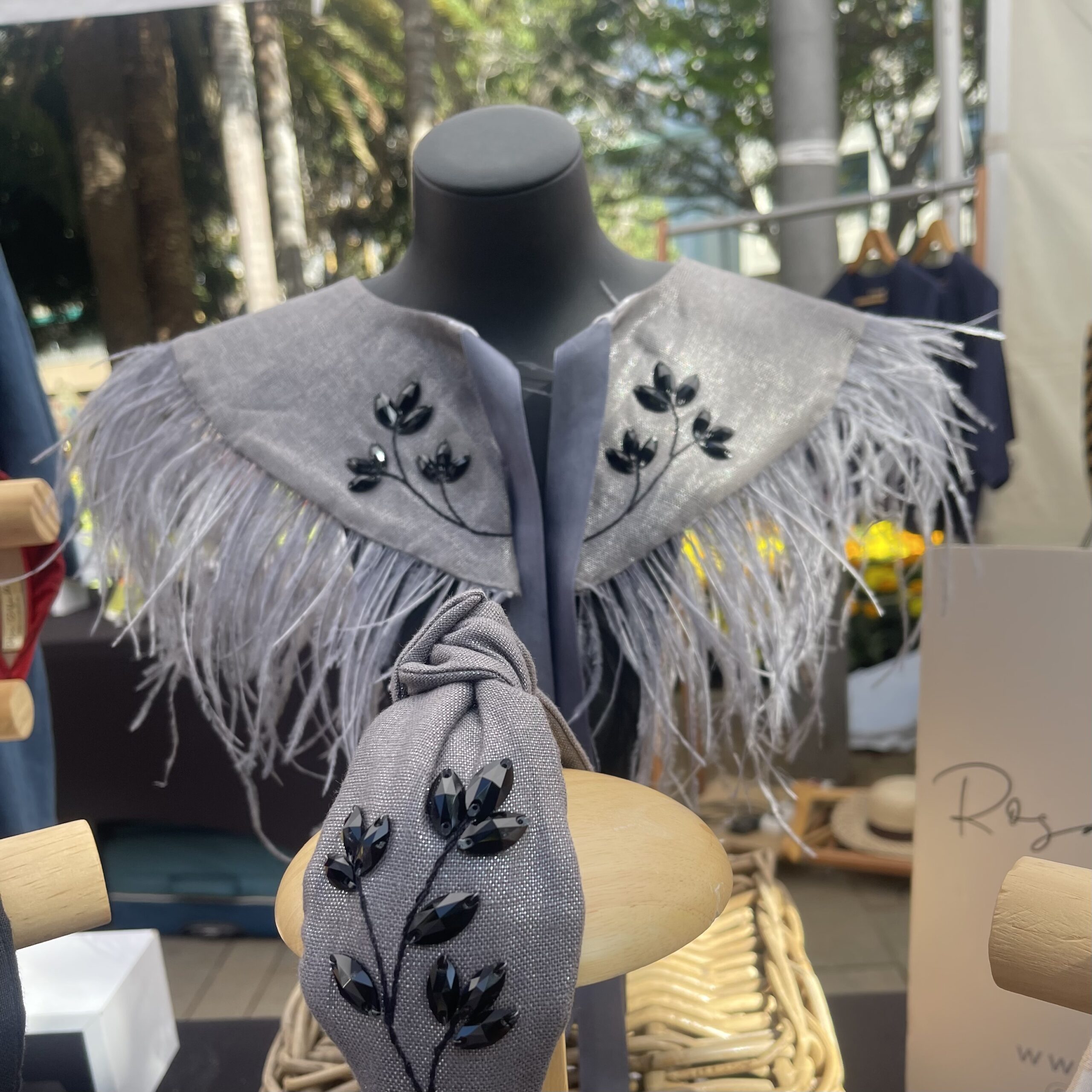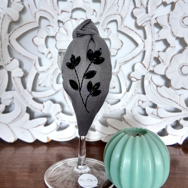 Diadema nudo, en lino gris metalizado con apliques en cristal negro por ambos lados.