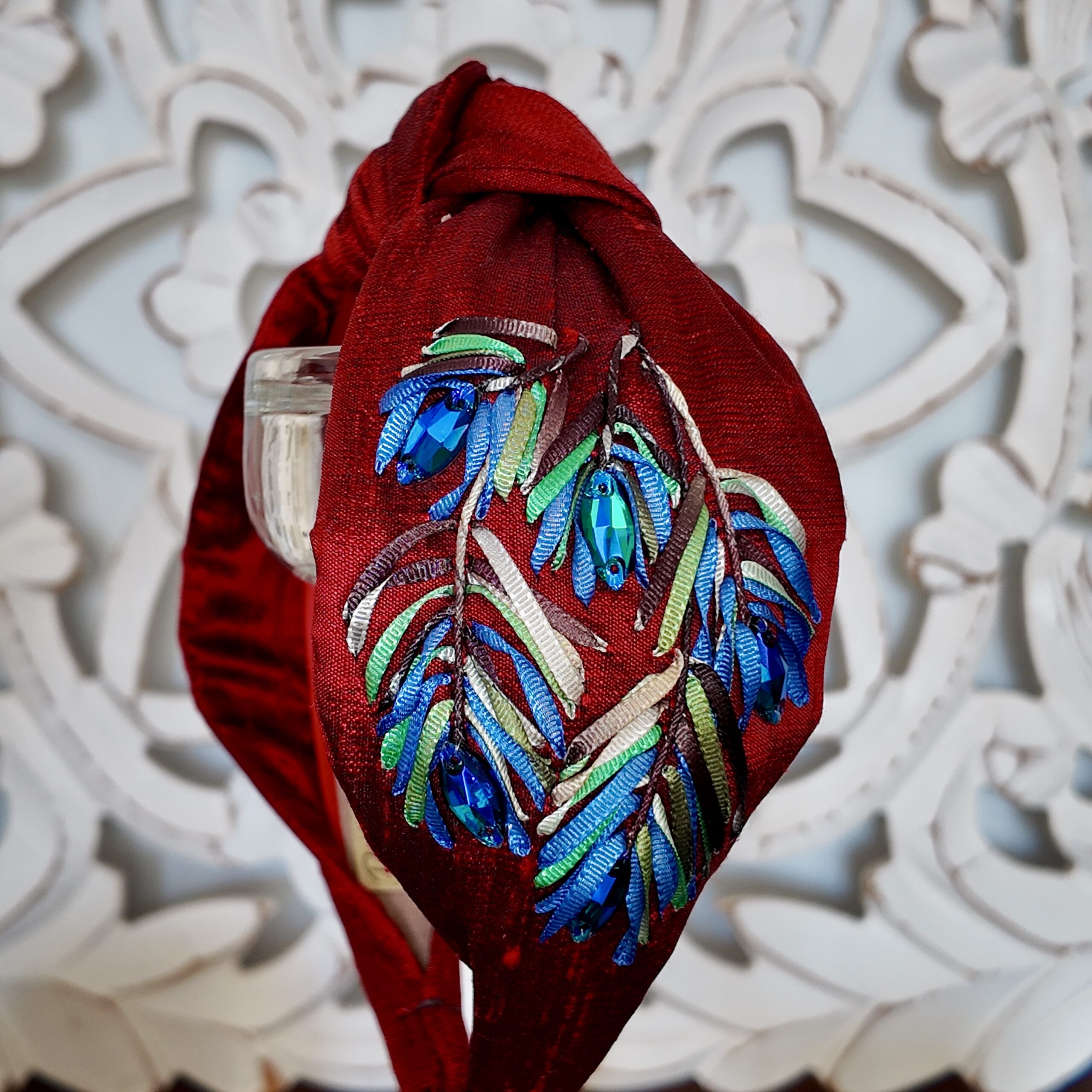 Diadema nudo, en seda color vino. Bordada en cinta con apliques de crital, cómodos y elegante.