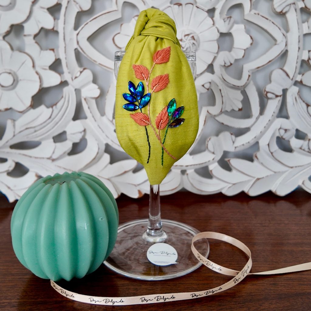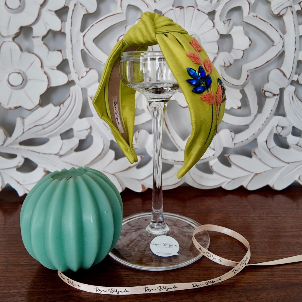 Diadema nudo, adaptable a todas las tallas, cómoda y suave, en seda lima tornasolada, bordada a mano en hilo de algodón coral y crital.