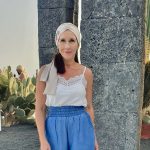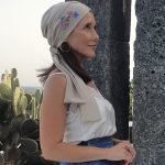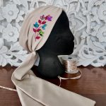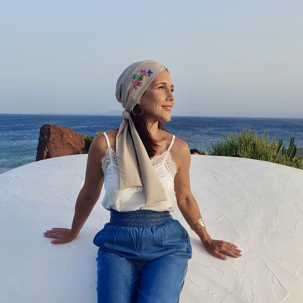 Turbante efecto pañuelo con lazada en la parte posterior.