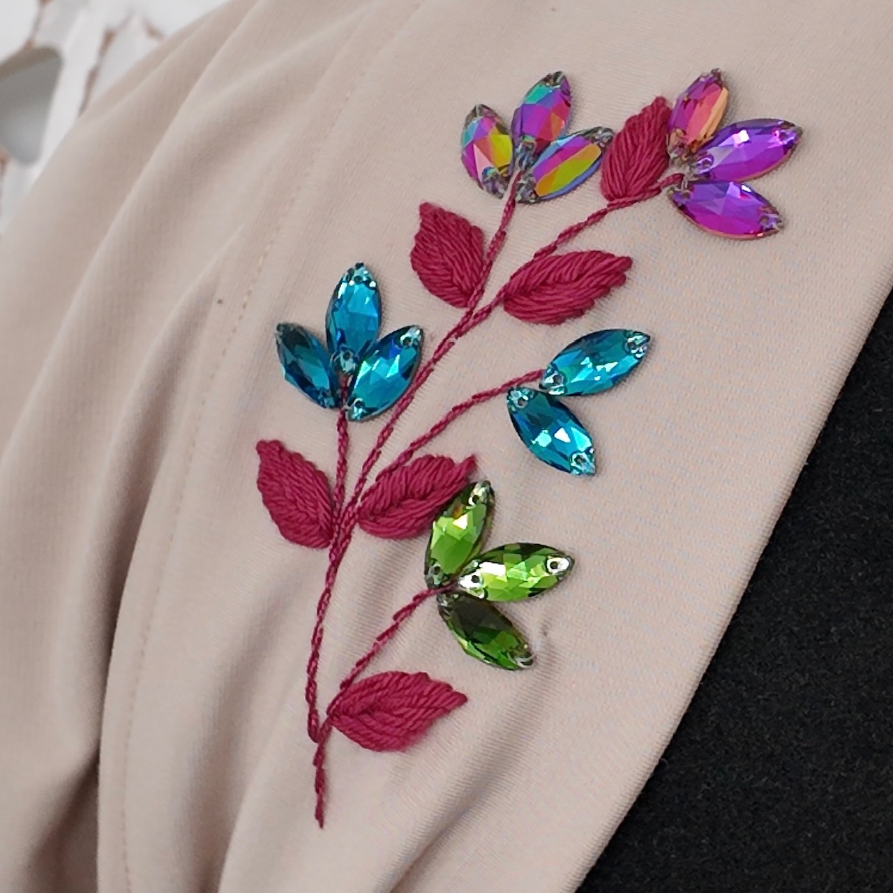 Realizado en una suave tela elástica y bordado a mano con cristal.